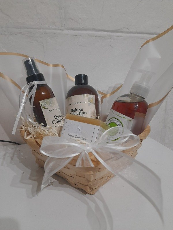 contiene: aceite para masajes, sales de baño, gel de ducha, vela aromatica, canasta organizadora